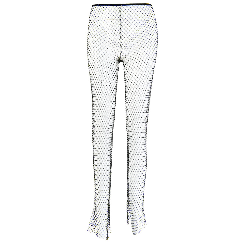 DIRTYLILY Crystal Diamond Shiny Women Pants Summer Hollow Out Fishnet Wide Leg Trousers Sexy See Through Beach Pant