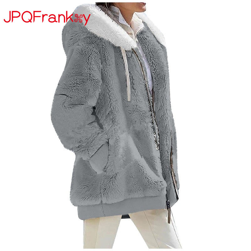 Europe and America Autumn and Winter Loose Plush Long Sleeve Zipper Pocket Hooded Warm Coat Women's Retro Quilt