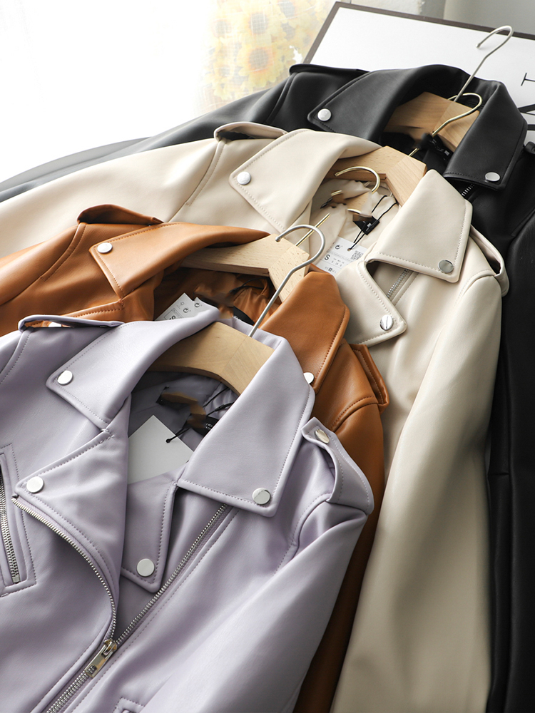 FMFSSOM Spring Autumn Women Zippers V-neck Faux Leather Jacket Minimalist Neutral Style Brown Motorcycle Jacket PU Streetwear