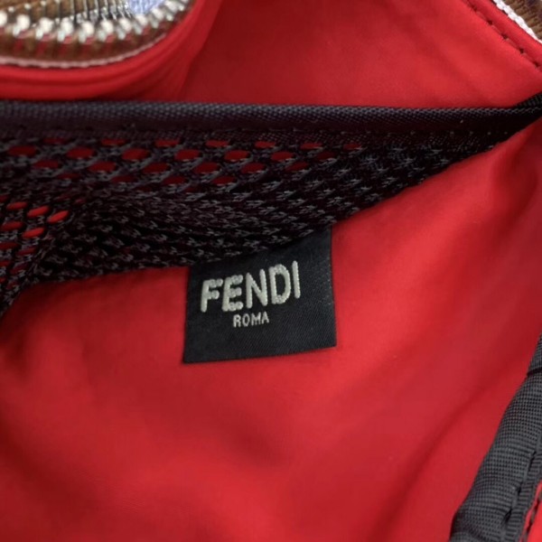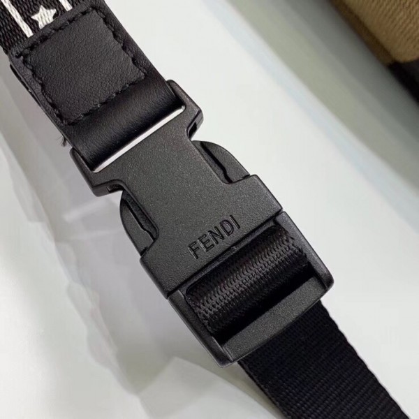 Small belt bag with zip fastening. Front zip pocket and internal mesh pocket. Adjustable belt. Made of jacquard fabric with iconic brown Pequin striped motif. Fendi Label appliqué in printed leather with gold lettering. Palladium-finish metalware.