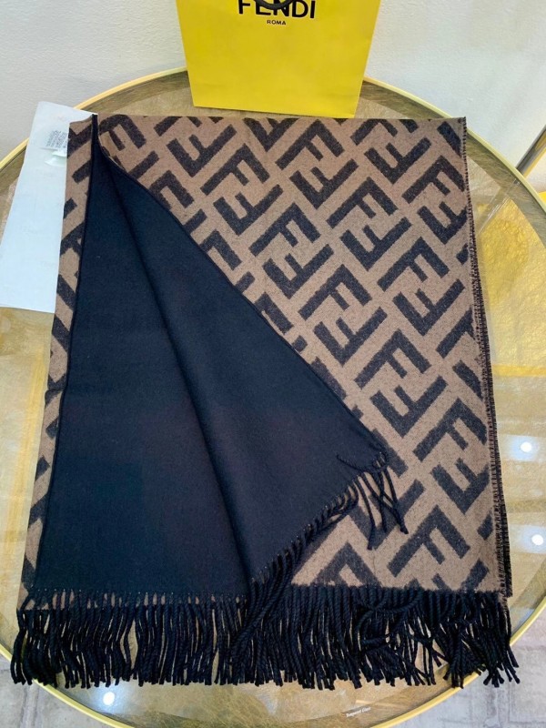 Large wraparound reversible poncho made from cashmere and wool. One side is embellished with the macro FF motif in shades of brown, while the other is plain black in colour. Finished with fringes at the hem.