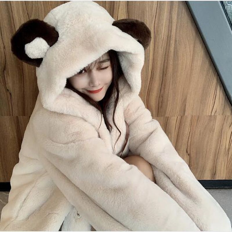 Fur Jacket Women Bear Ear Plush Jacket Winter Cute Preppy Style Oversized Hooded Loose Kawaii Fluffy