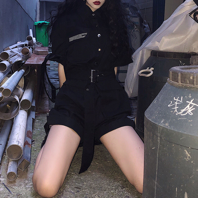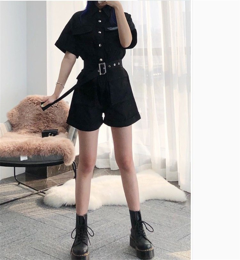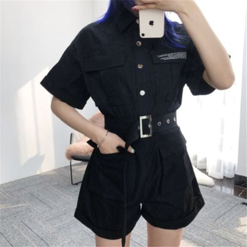 Gothic Cargo Playsuit Female Summer Solid Black High Waist Short Sleeved Playsuit Wide Leg Suits Overalls Women Combinaison