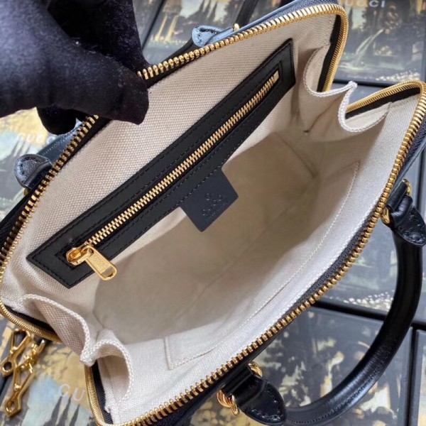 A new silhouette introduced to the Gucci 1955 Horsebit line for Spring Summer 2020, the top handle has a domed shape with an optional leather shoulder strap, crafted from black leather. The collection unifies details first introduced on the original bag that inspired the line from over six decades ago with a modern spirit, highlighting the Horsebit. Part of Gucci’s genetic code, the double ring and bar design has been established as one of the most distinctive elements among the House symbols borrowed from the equestrian world.