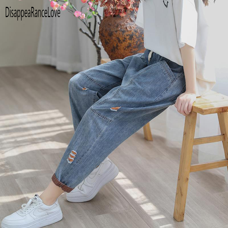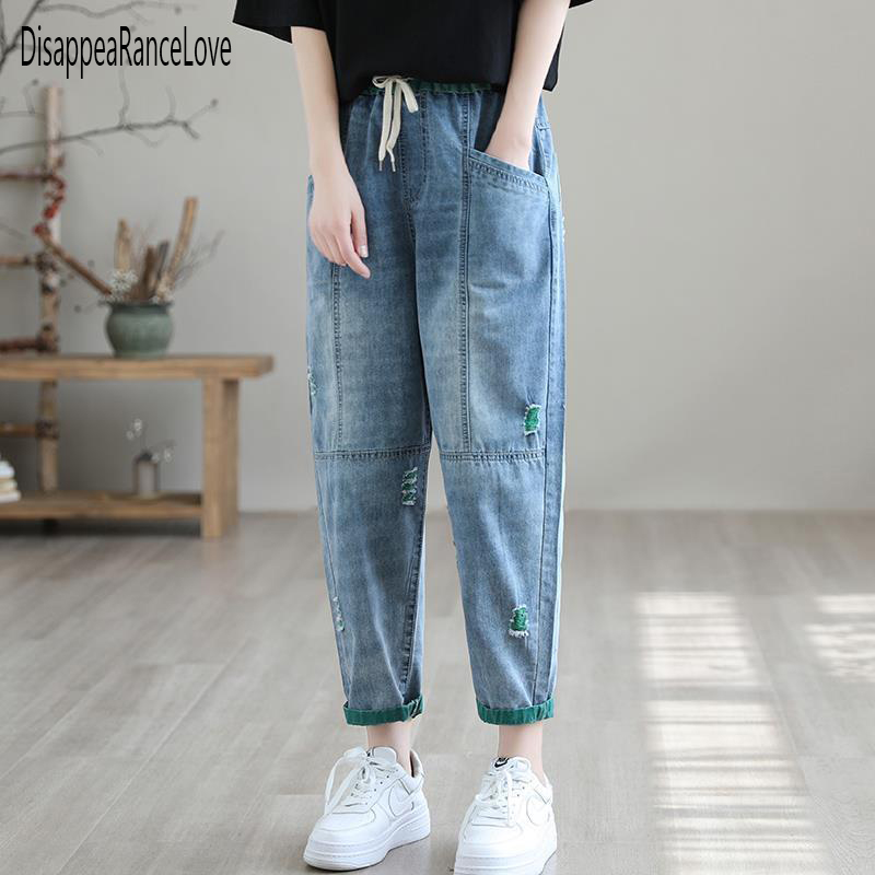 Harem Pants Women's Jeans Embroidery Ripped Capris Straight Leg Pants Ladies Streetwear Vintage Cute Denim Trousers