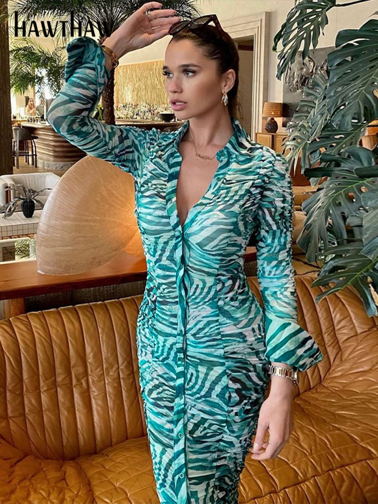 Hawthaw Women Elegant Long Sleeve Printed Bodycon Streetwear Green Midi Dress Autumn Clothes WholeItems For Business