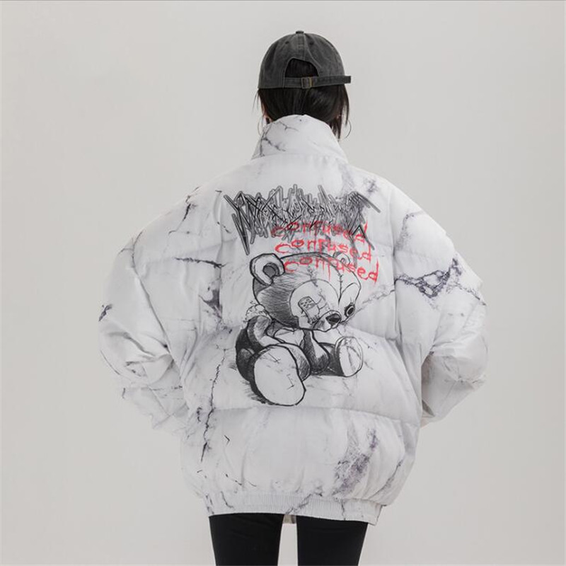 Hip Hop Jacket Parka Hurt Bear Print Men Winter Oversize Windbreaker Streetwear Harajuku Padded Jacket Coat Warm Outwear Hipster