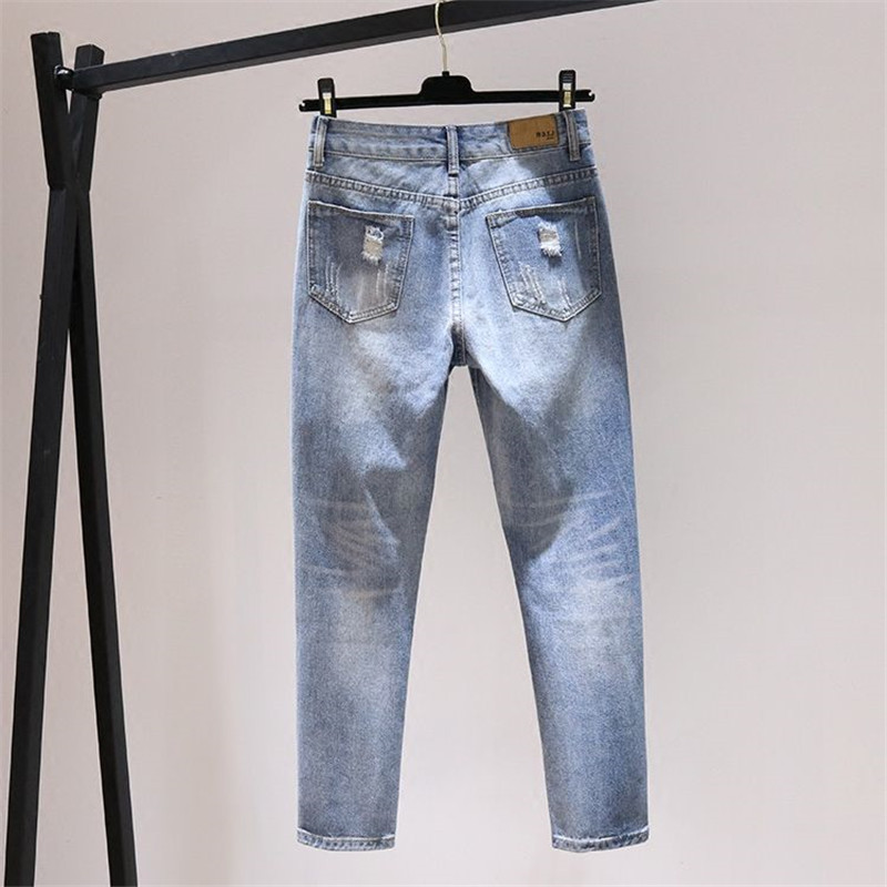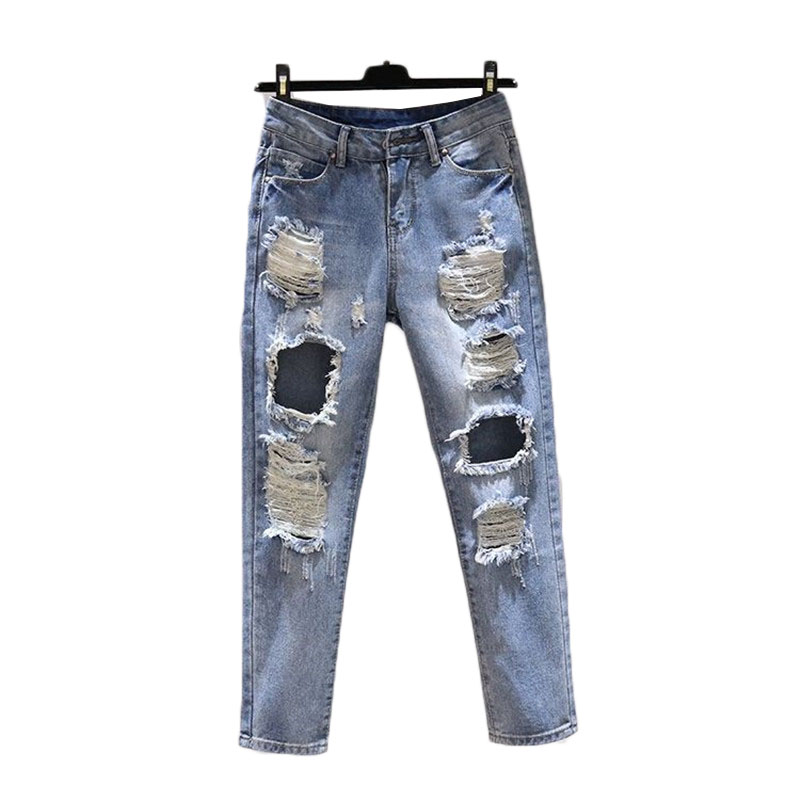 Hole JeansWomen Spring Summer Loose Bf High Waist Denim Pants Women Straight Nine Points Harem Cowboy Trousers W692