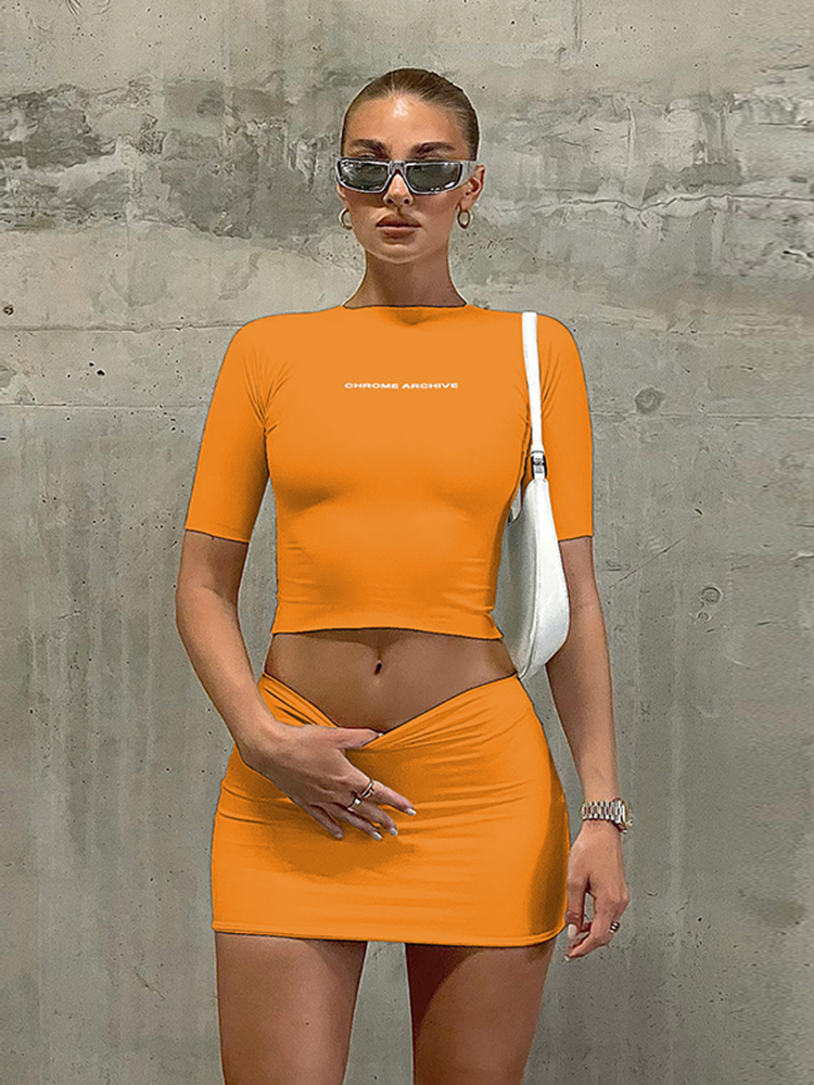 Hugcitar Letter Print Solid Turtleneck Short Sleeves Crop Top Skirts 2 Pcs Set Sexy Slim Summer Outfit Streetwear Sports