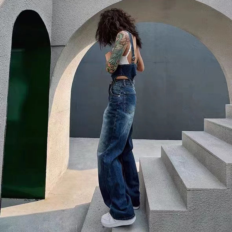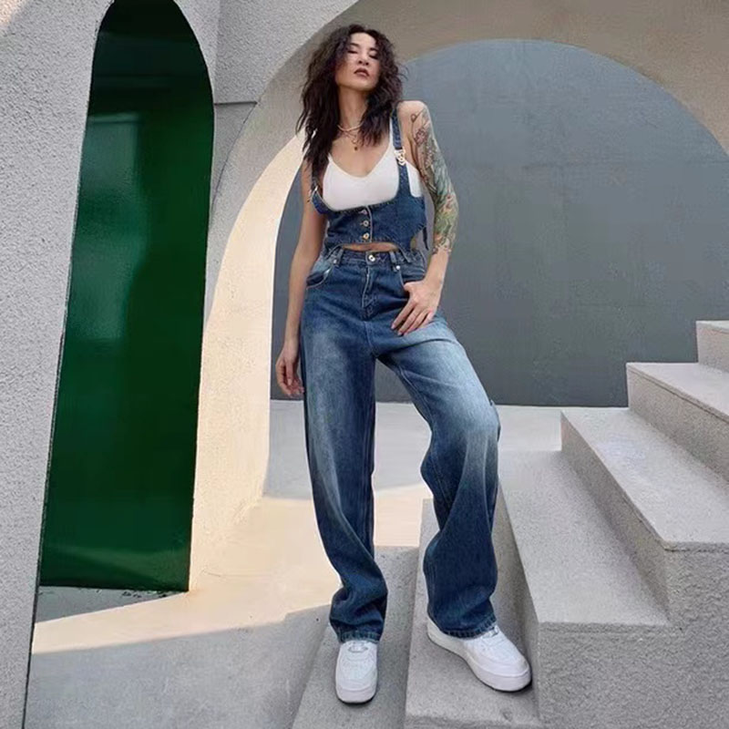 Jeans Woman Spring and Autumn loose two-piece set with suspenders denim straight trouser set waistcoat wide leg pants
