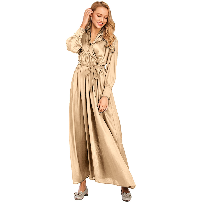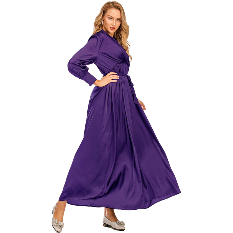 Jilbab Muslim Dress Arab Ladies Summer and Autumn V-neck Lace up Long-sleeved Dress Elegant Style Abaya Islamic Dubai Dress
