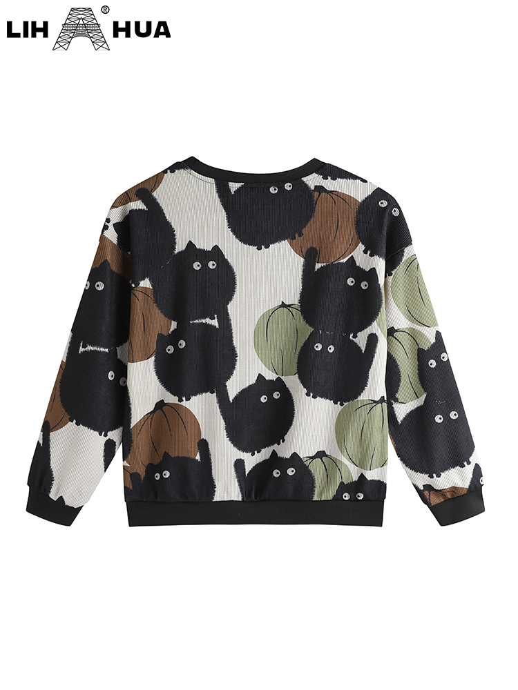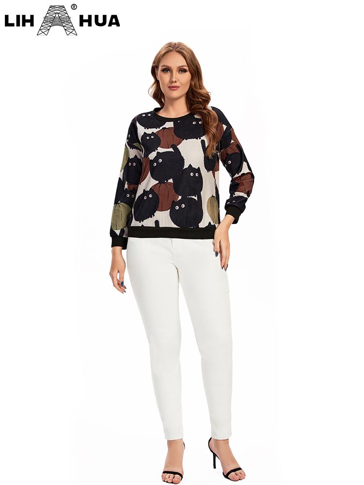 LIH HUA Women's Plus Size T-Shirt Spring Cotton T-Shirt Long Sleeve Printed Cartoon Graphic Top Round Neck Elastic Loose Top