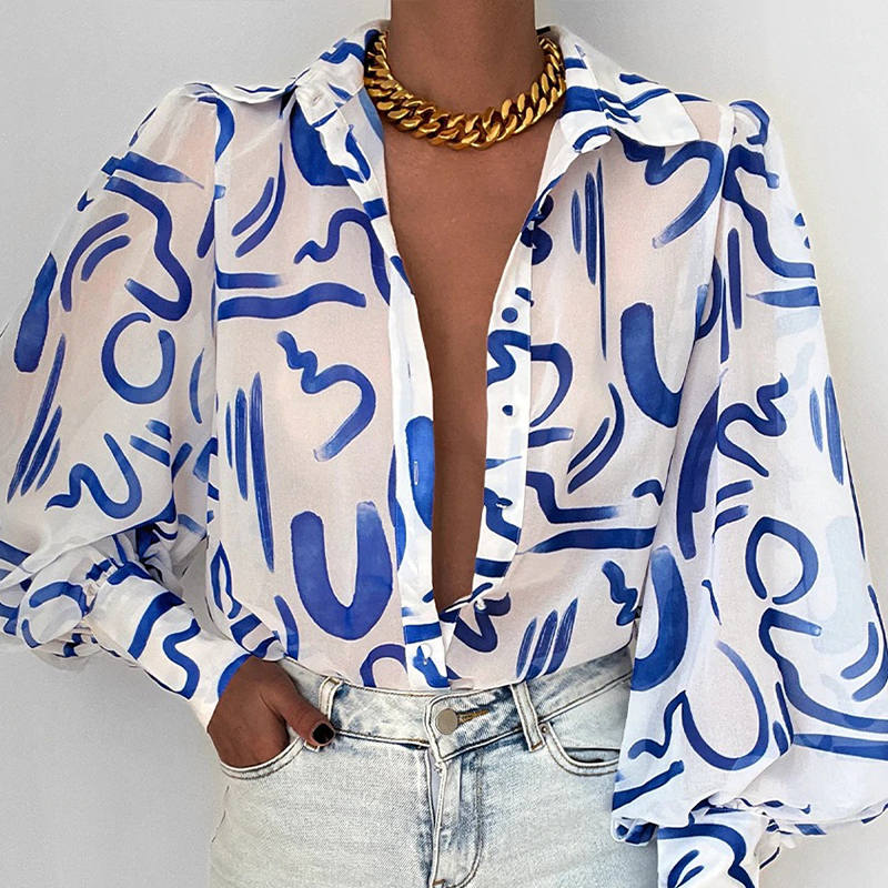 Lapel Single-breasted Loose Blouse Summer Tulle Long Lantern Sleeve Shirts Women Elegant Print Mesh Chiffon Tops Blouse