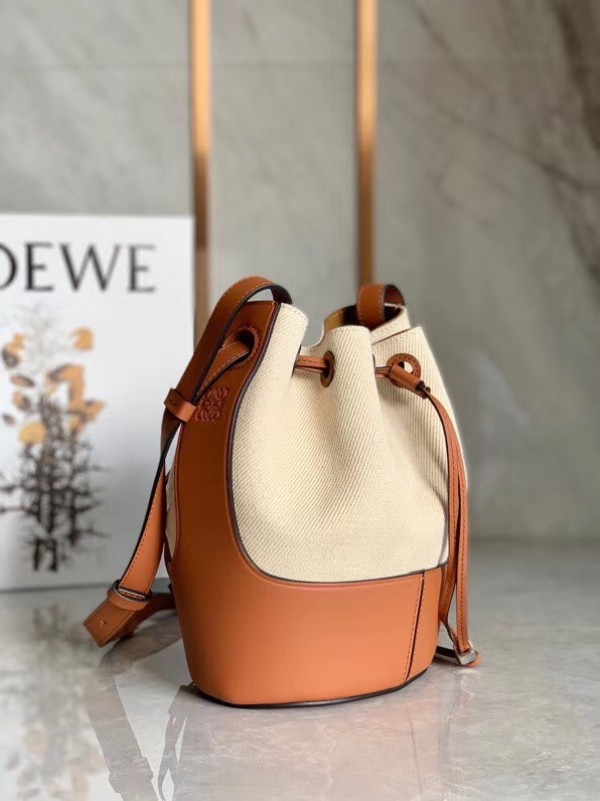 Loewe’s Balloon bucket bag is a brand new style for Spring ’20. This small version has been made in the label’s historic Madrid workshop from cotton-canvas and tan leather. The base is debossed with the house’s recognizable swirling logo, too.