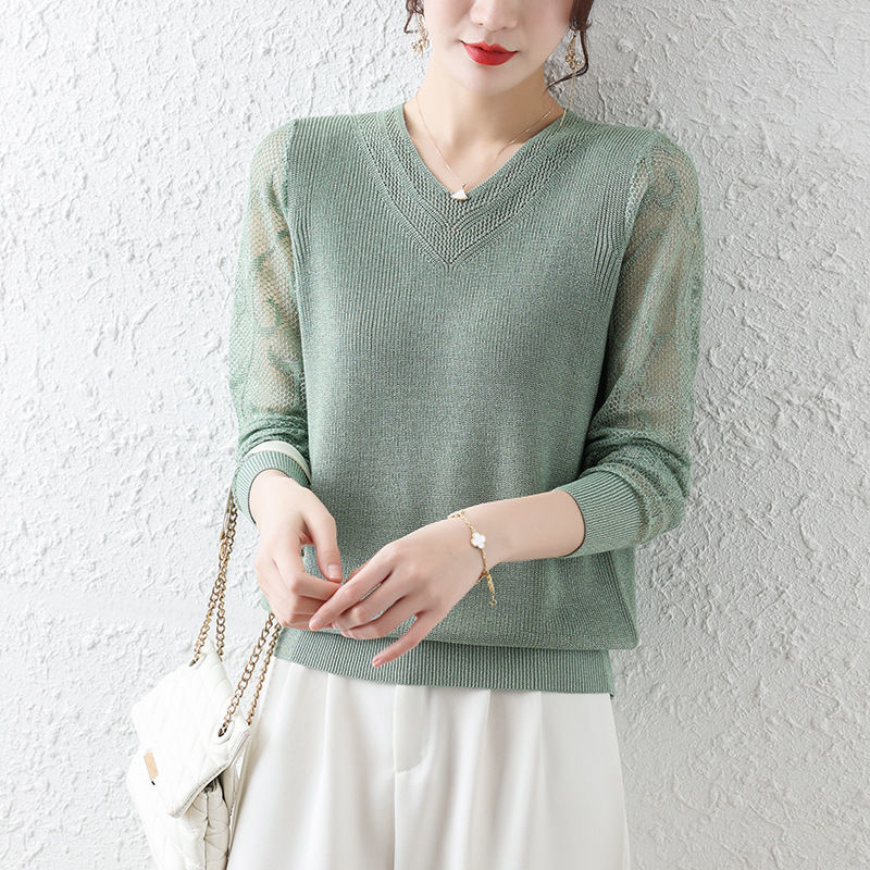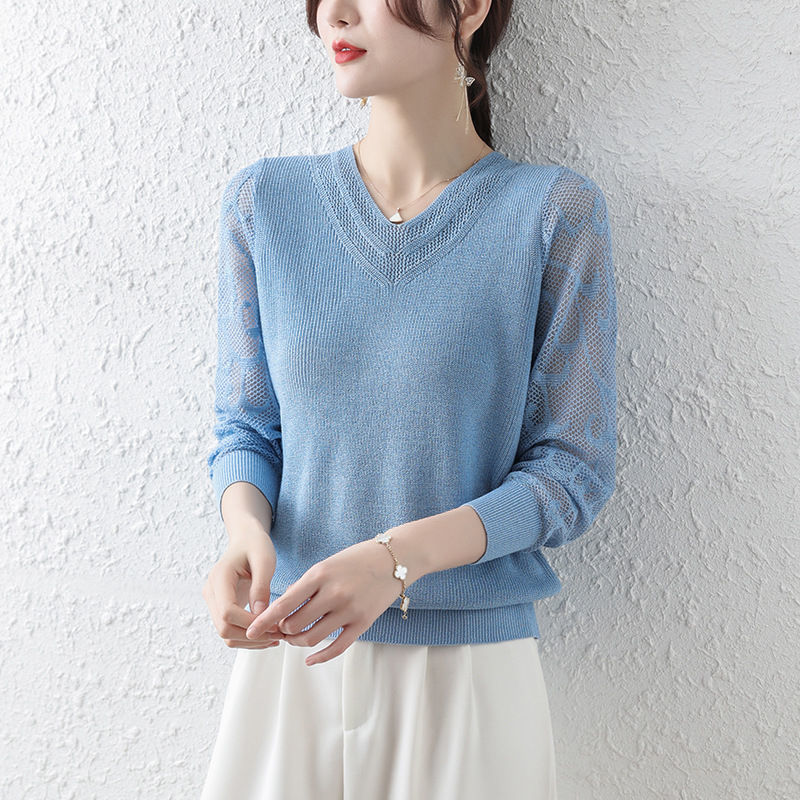 Loose Bottoming Shirt Women's Long-sleeved T-shirt Spring and Autumn Thin Hollowed-out Western-style Knitted Top