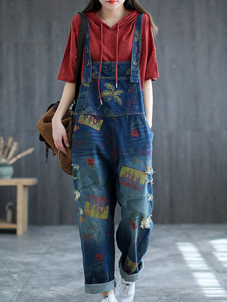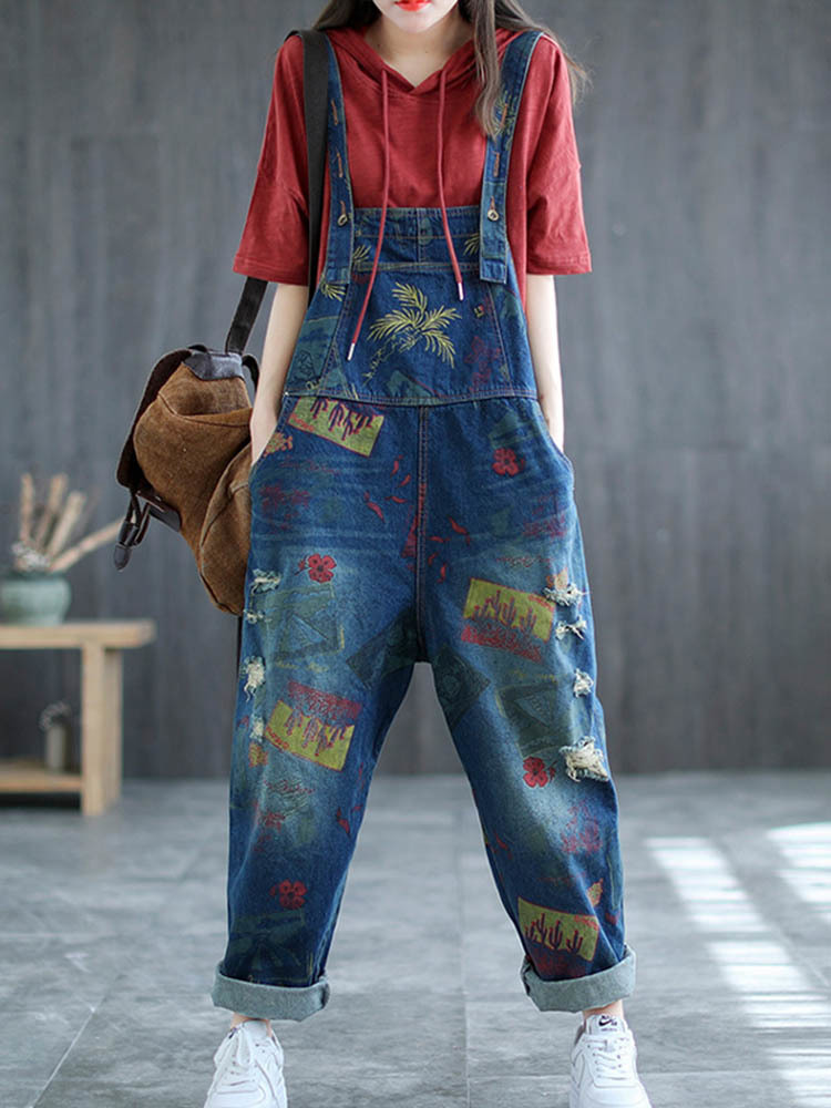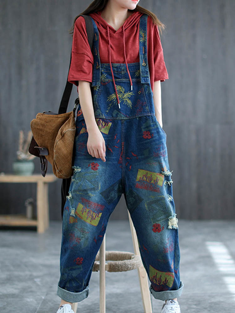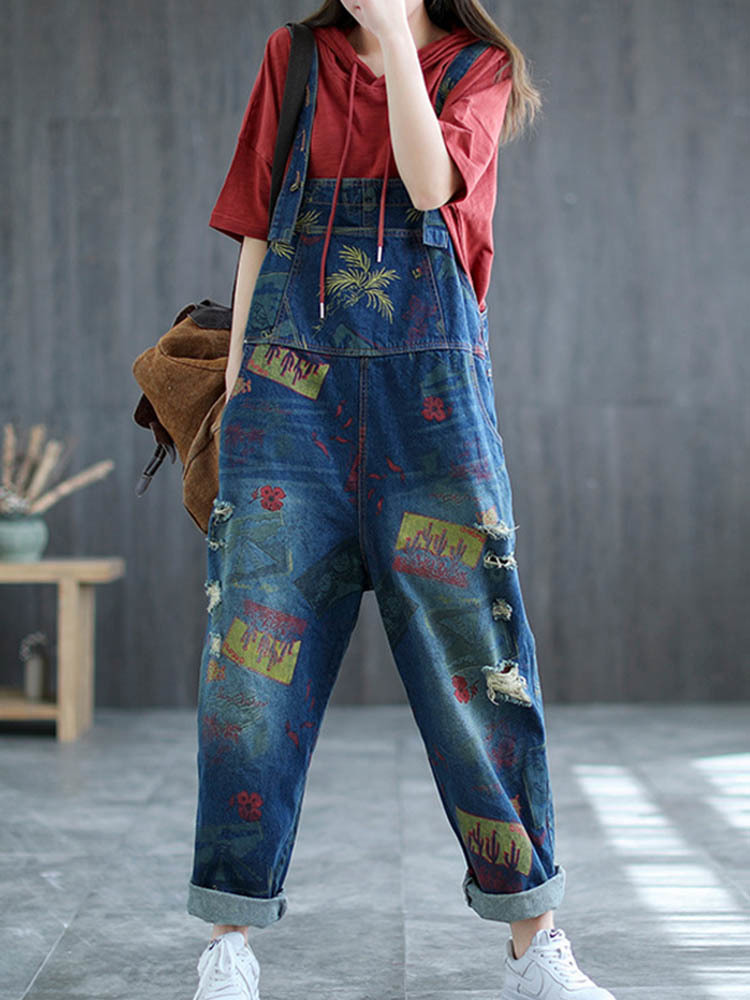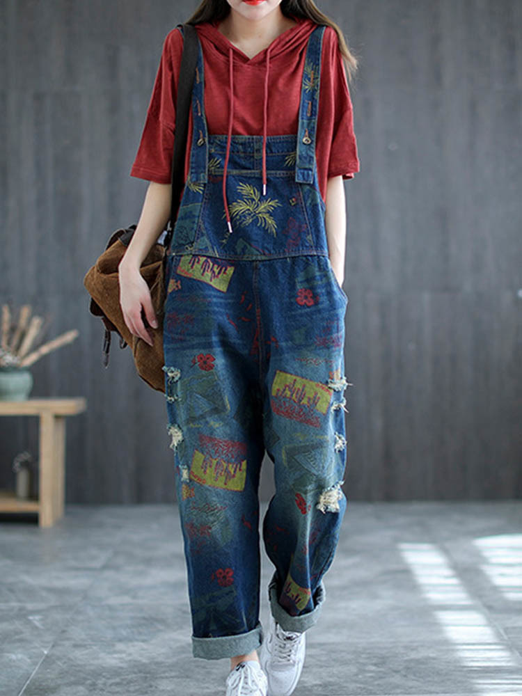 Vintage Denim Cuffs Printed Ripped Holes Overalls