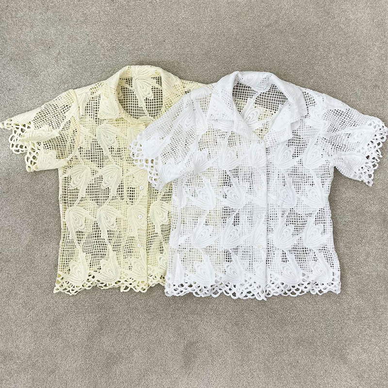 OROT@ Summer 2 Colors Polyester Hollow Lace Short Sleeve Lapel Daily Casual Cardigan Blouse