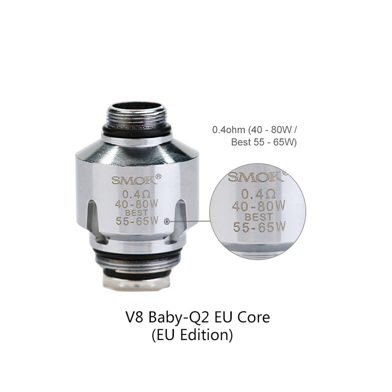 Coil Optional V8 Baby Q2: Dual coils, 0.4ohm (40-80W / Best 55-65W), 0.6ohm (20-50W / Best 30-40W)