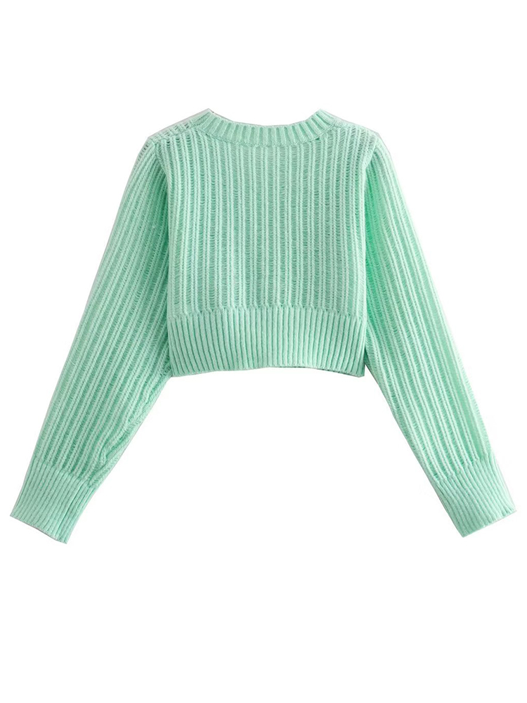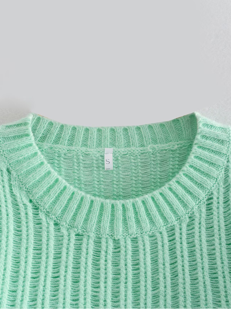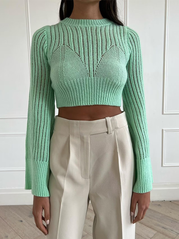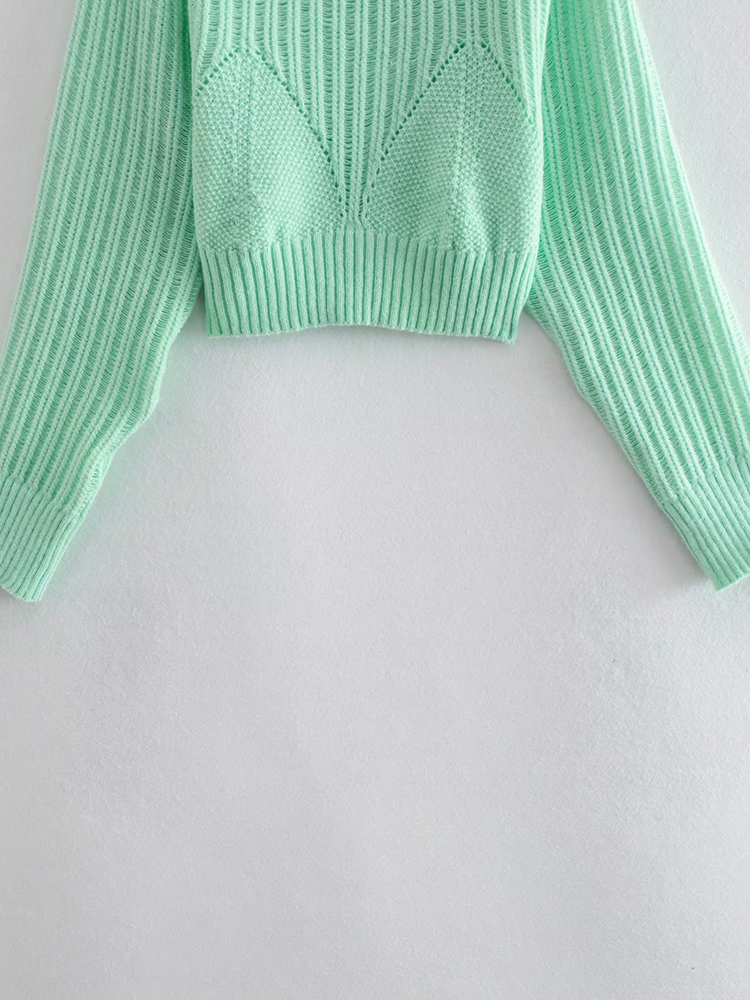 PUWD Women Green Cropped Open Knit Pullover 2022 Fall/Winter Ladies Sweater O-neck Vintage Solid Female Chic Crochet Knitwear