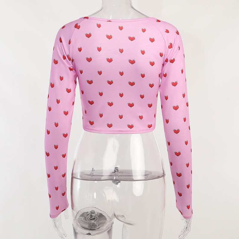 Pink Crop Tops V Neck Full Sleeve Hollow Out Strawberry Print Solid Pearl Buckle Short Cute T-Shirts Women Female Summer Autumn
