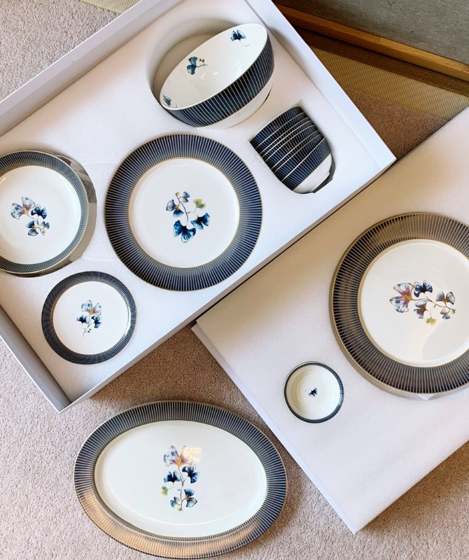 Set composition: Dining plate 26 cm – 6 pcs, soup plate 23 cm – 6 pcs, dessert plate 15 cm – 8 pcs, bowl – 8 pcs, small bowl – 2 pcs, oval dish 36.5 cm – 1 pc, round dish 31 sm – 1 pc, salad-bowl – 1 pc and leather storage box