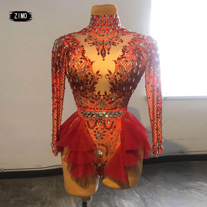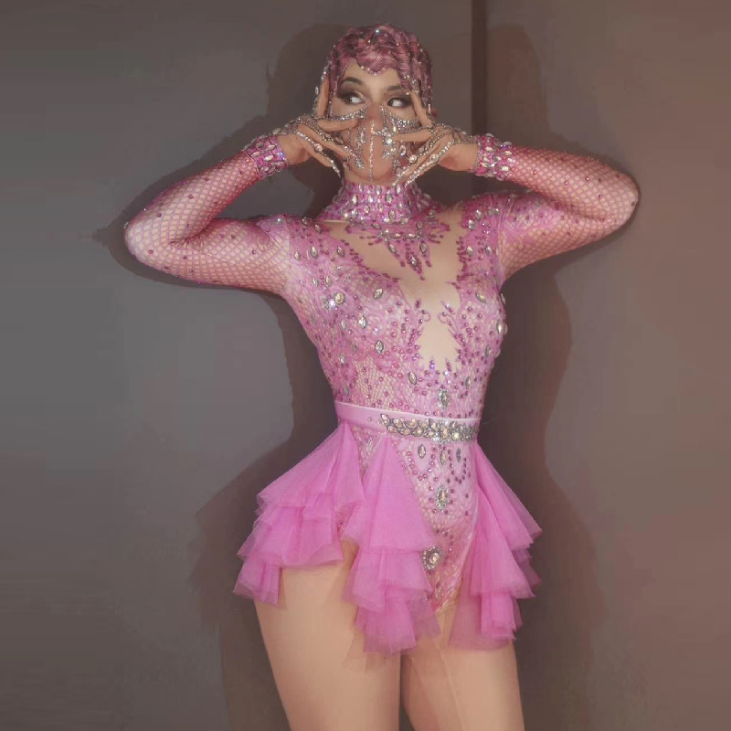Rhinestone pink Ruffles Bodysuit Womens Big Stretch nightclub Prom Bar concert outfits Stage Singer Show dance Leotard