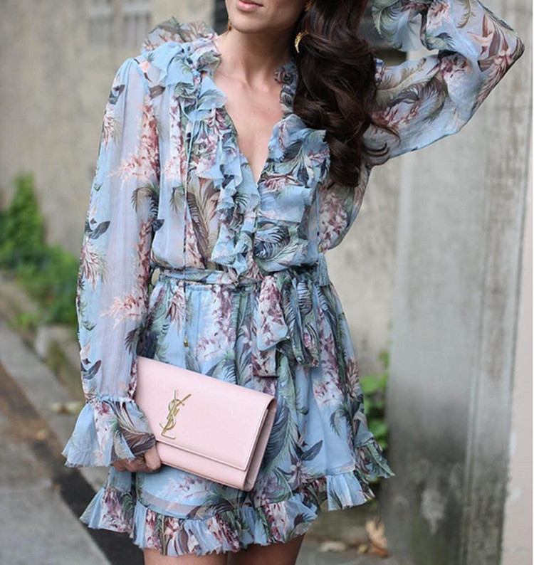 Runway Summer Women Rompers Blue Print Floral Long Sleeve Chiffon Sexy V Neck Female Outfits Sashes Beach Jumpusits