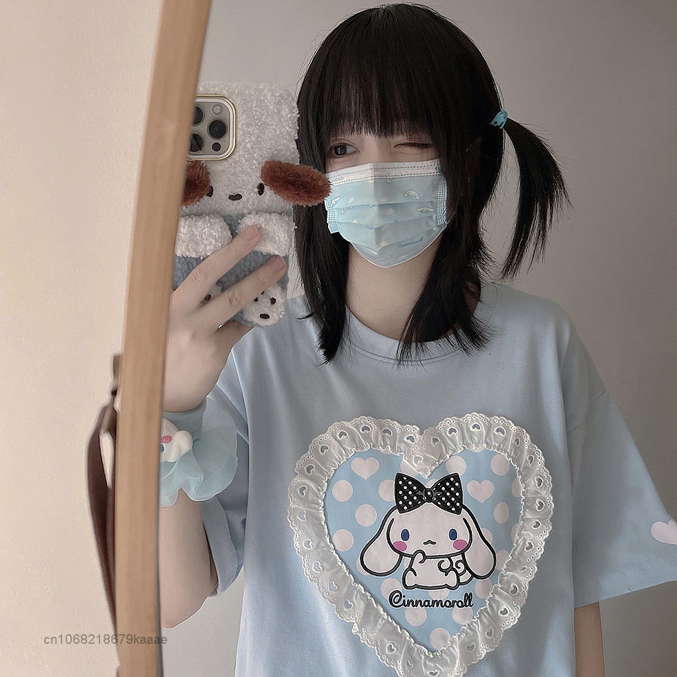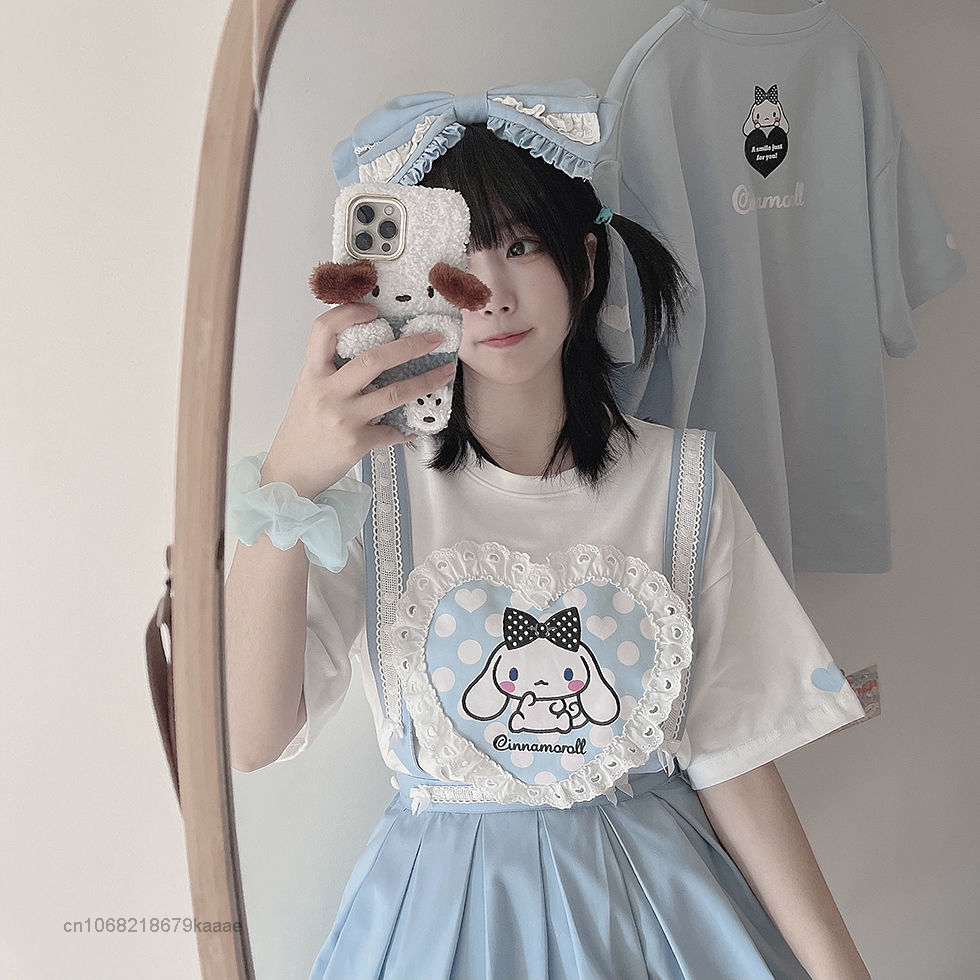 Sanrio Streetwear Cinnamoroll Lace T Shirts For Women Girls Tshirt Student Harajuku Kawaii Cute Lolita Loose Vintage Clothes Top