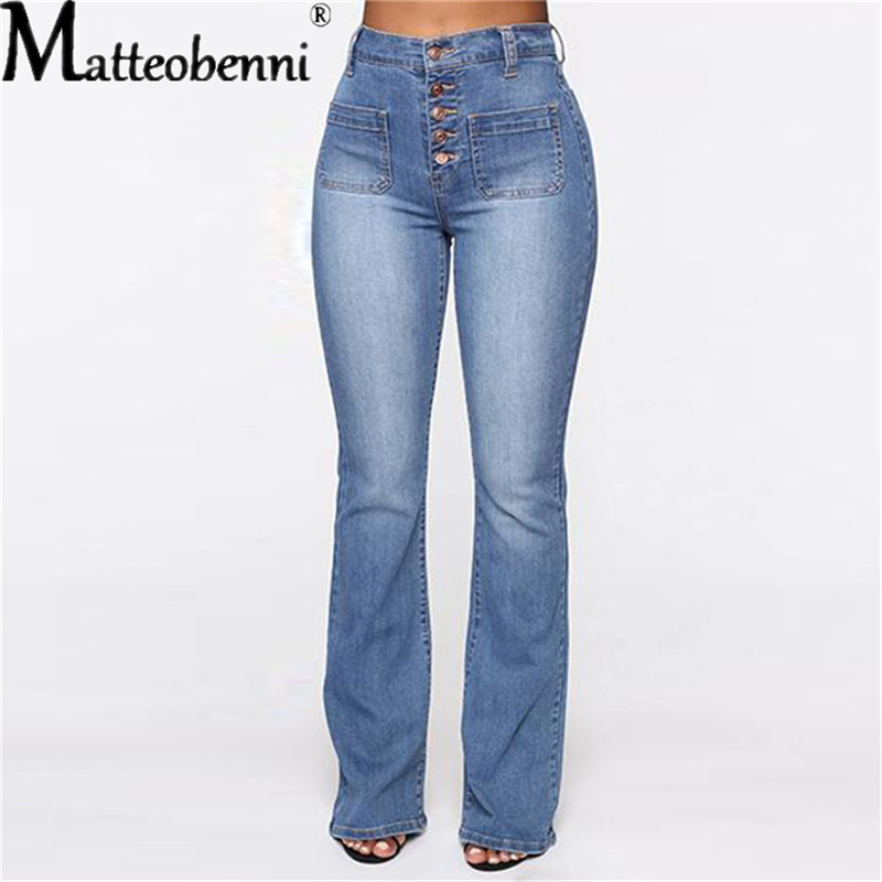 Sexy High Waist Elastic Jeans Women Button Washed Denim Pants Femme Pocket Trouser Bootcut Straight Leg Jeans Mujer