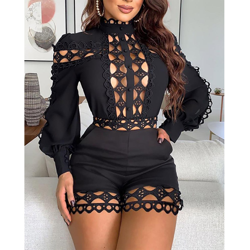 Sexy Hollow Out Playsuits for Women Summer Long Sleeve Skinny Nightclub Overall Woman Clothing