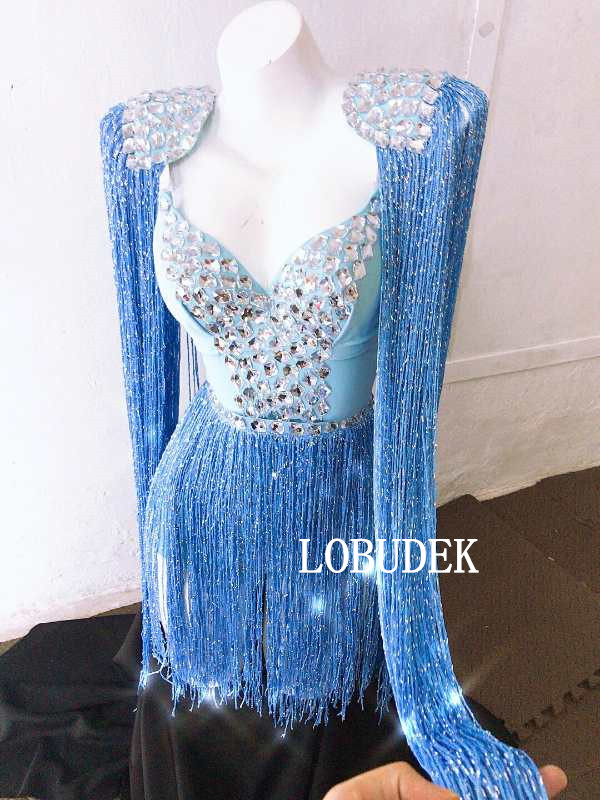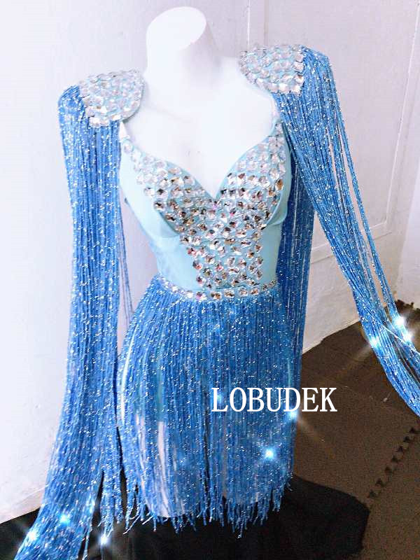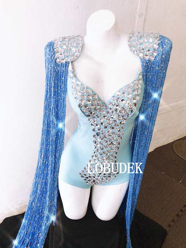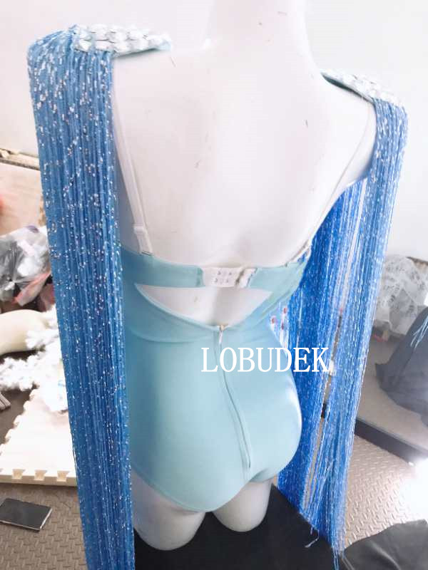 Sexy V-Neck Rhinestones Pink Blue Fringes Epaulet Bodysuit DJ Singer Nightclub Costume Elastic Tassels Catsuit Women Stage Wear