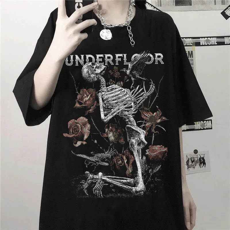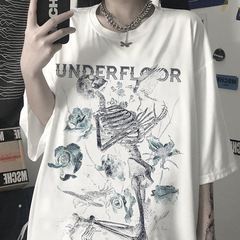 Skeleton Print Gothic T-Shirt Women's Grunge Aesthetic Goth T Shirt Dark Edgy Streetwear Graphic Tee Unisex Couple Tops
