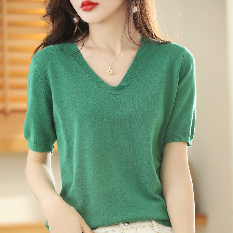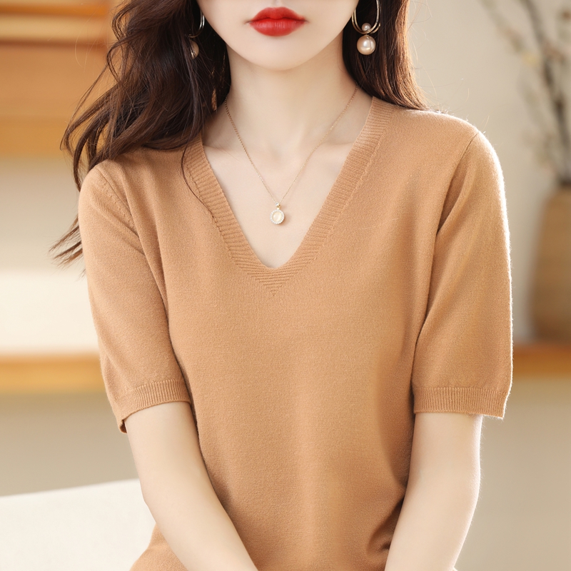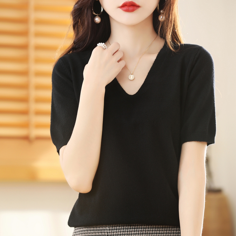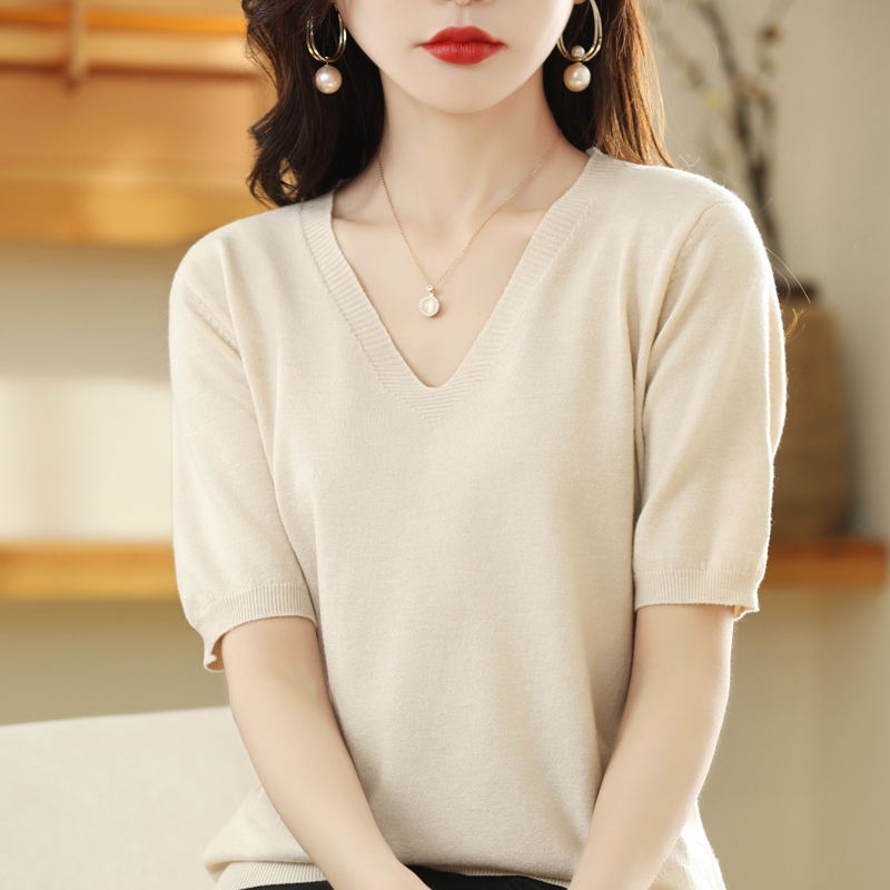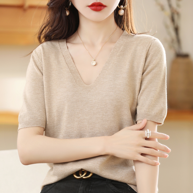 Slim V-Neck Knitted Sweater Tops Women's Summer All-Match Bottoming Shirts With T-Shirts Short Sleeves Large Size