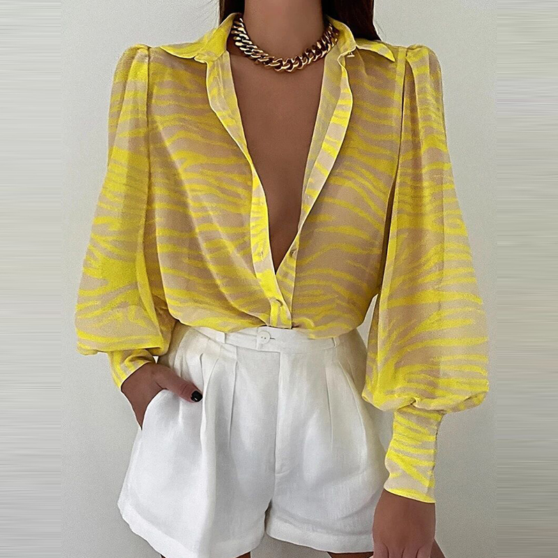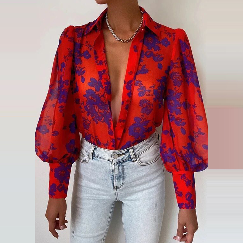 Spring Women Shirt Lantern Long Sleeves Casual Floral Printed Buttons V Neck Blouse Commute Elegant High Street Shirts
