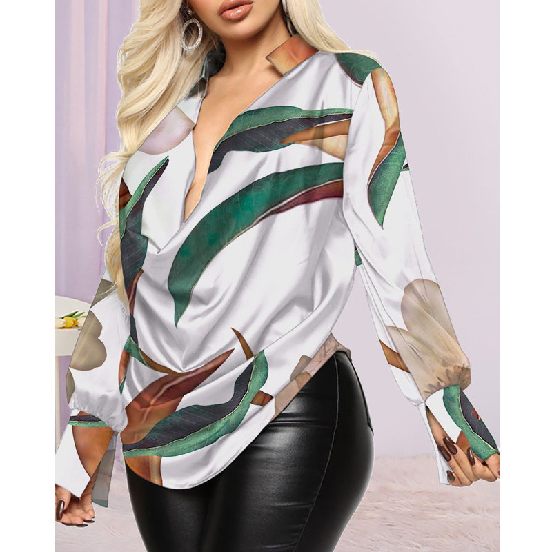 Spring Autumn Women Sexy Deep Cowl Neck Blouse Long Sleeve Casual Vintage Chain Graphic Print Long Sleeve Street Top Female