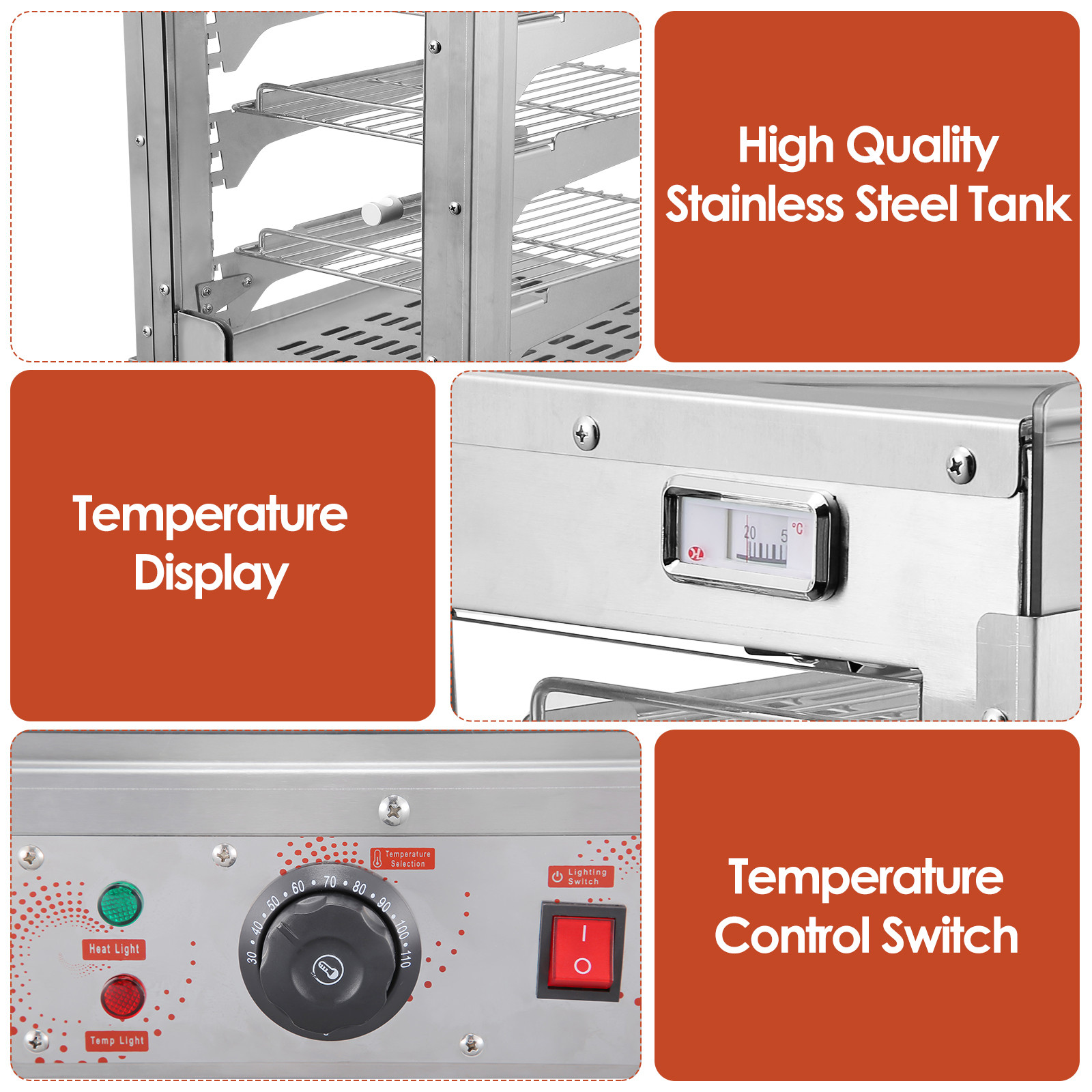 1. Even heat preservation. The bottom of the heat preservation cabinet is covered with multi-ring heating pipes, and the heat flow surface evenly spreads from bottom to top in the entire heat preservation cabinet during heating, so the food gets a sufficient and stable heat flow contact to ensure uniform and no temperature difference.
