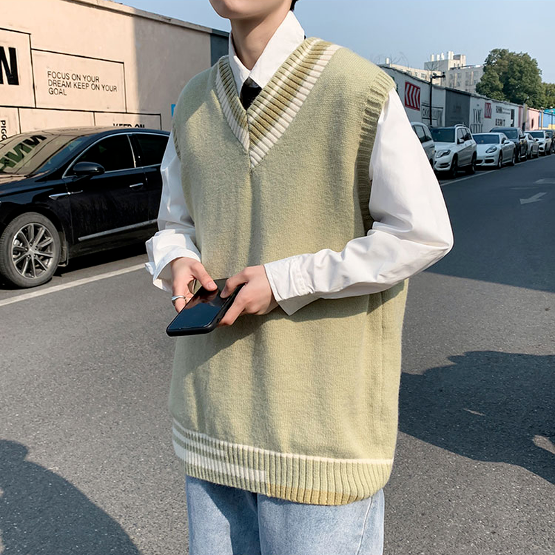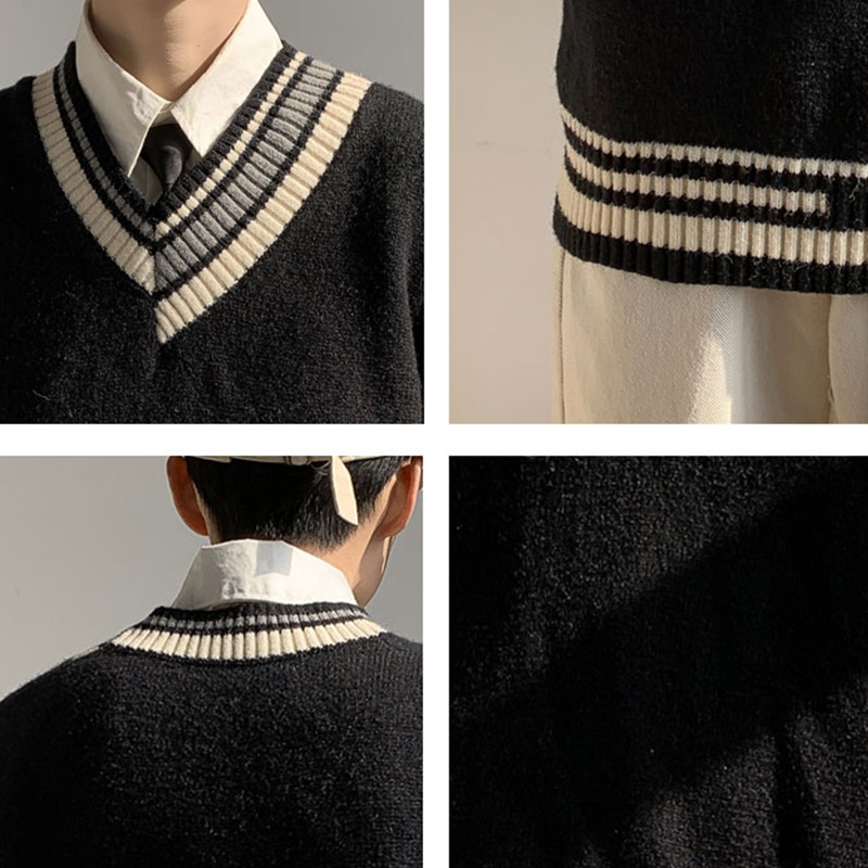 Striped V-neck Sweater Vests Men Loose Sleeveless Knitwear Male Preppy Style Autumn Warm Thermal Jumpers College Simple Baggy