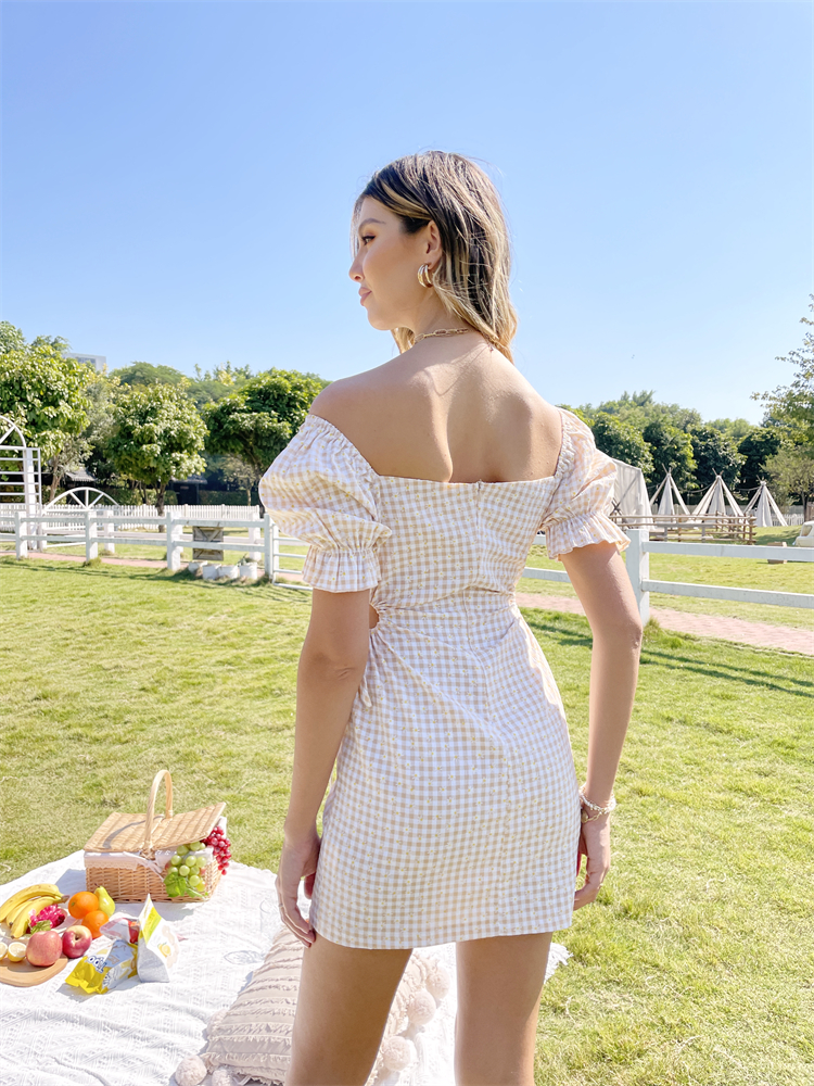 Summer Collection Women Clothing Young Girls Gingham Square Neck Puff Sleeve Waist Cut Off Self Belt Mini Dress