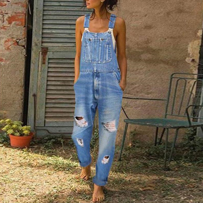 Summer Sleeveless Casual Ripped School Bag Strap Jeans Teen Jumpsuit Jumpsuit Women's Ripped Denim Overalls Pants
