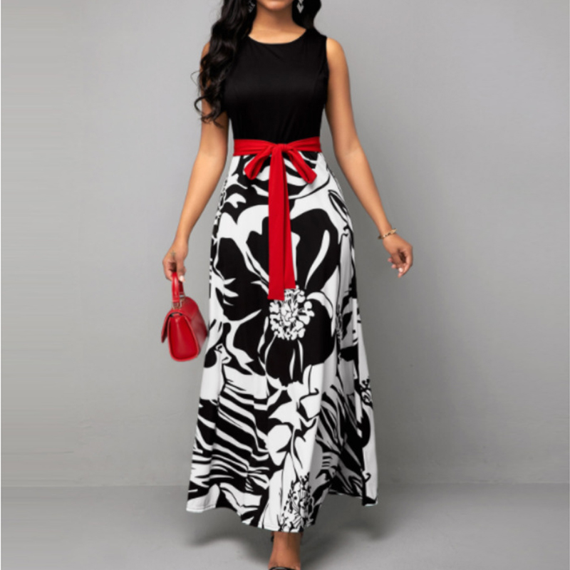 Summer Women's Sleeveless Printed High Waist Patchwork Lace Up Casual Long A-line Dress Elegant Holiday Robe Dresses