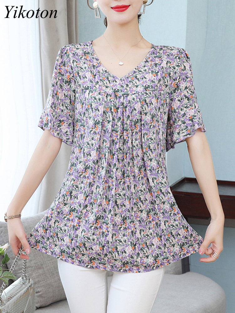 Summer Women's Tops Short Sleeved Ladies Blouse V-Neck Large Size Loose Top Chiffon Shirt Folds Casual Print Blouses Blusas