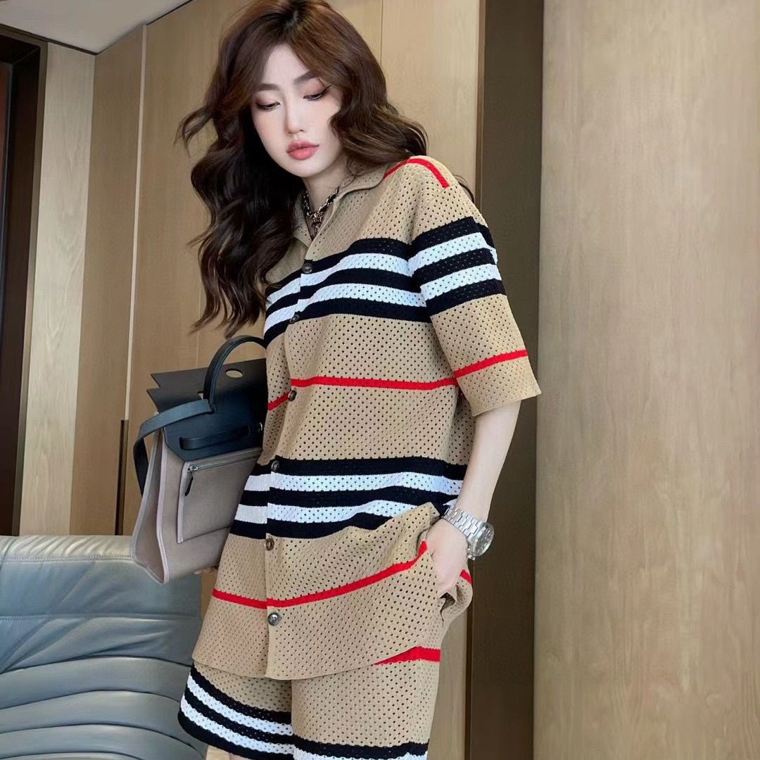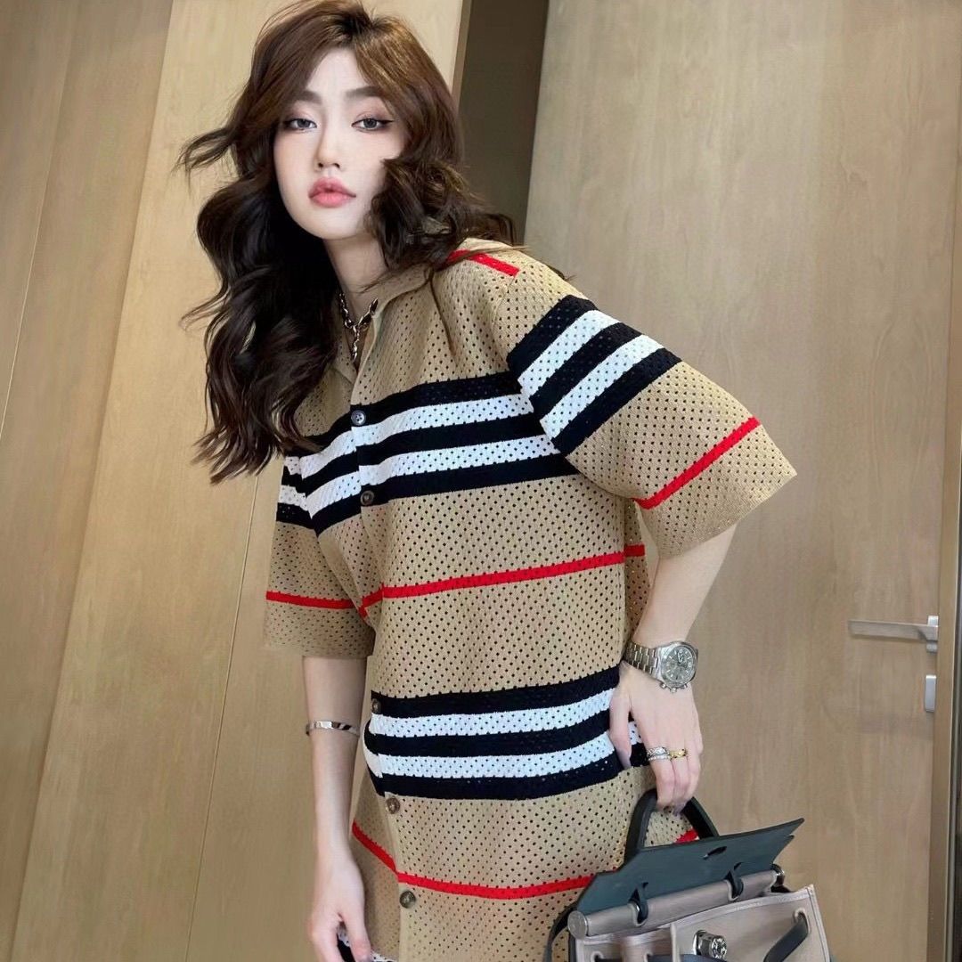Summer hollow polo collar short-sleeved ice silk cardigan shorts suit loose striped casual sports knitted two-piece suit women's