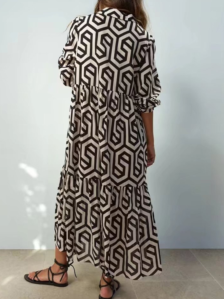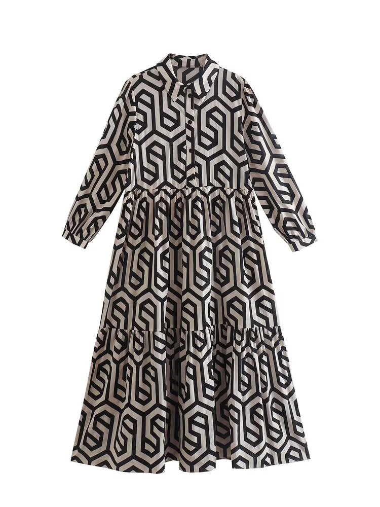 TRAF Women Summer Print Dress Vintage Female Party Mid-Calf Geometric Vestidos Half Sleeve High Waist Vestidos Mujer