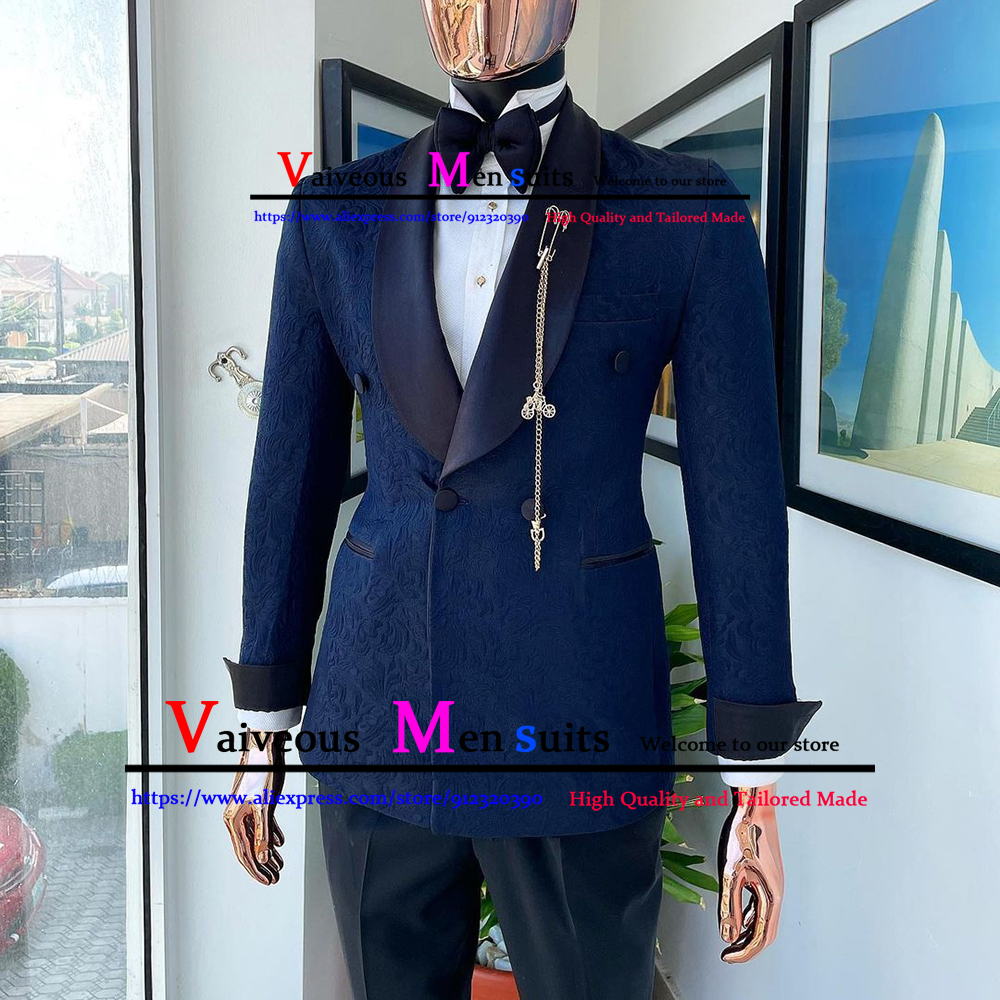 Tailor-Made Men Suit 2 Pieces Classic Navy Blue Jacquard Wedding Suit for Men Slim Fit Groom Tuxedo Costume Mariage Homme