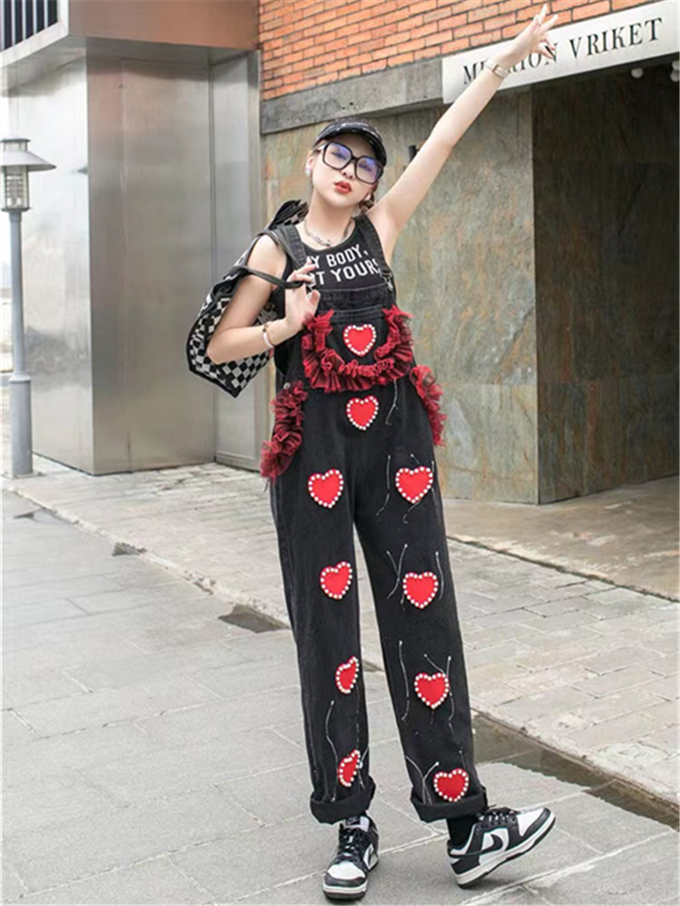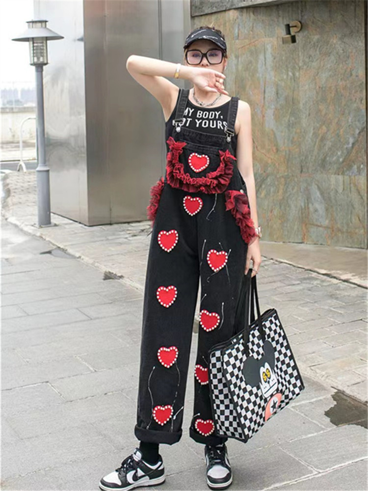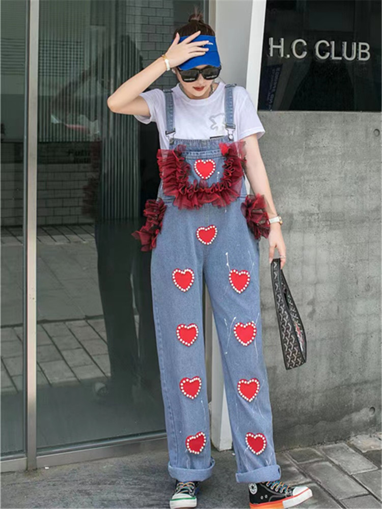 Tide able and foreign love beaded denim overalls women's unique loose mesh stitching sequin trousers