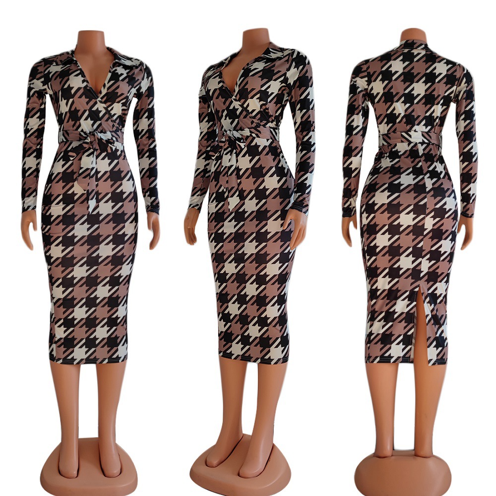 UFOA Ladies Casual Fall Print Grid Commuter Sexy V-neck Long Sleeves Retro Hip Bag Long Dress