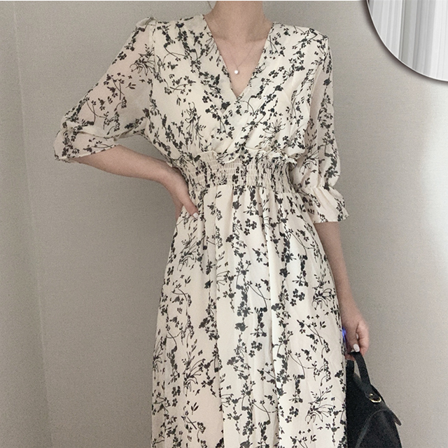 Vintage Korea Clothing Summer Slim Elastic Waist A Line V Neck Elegant Office Lady Floral Chic Chiffon Long Dress Retro