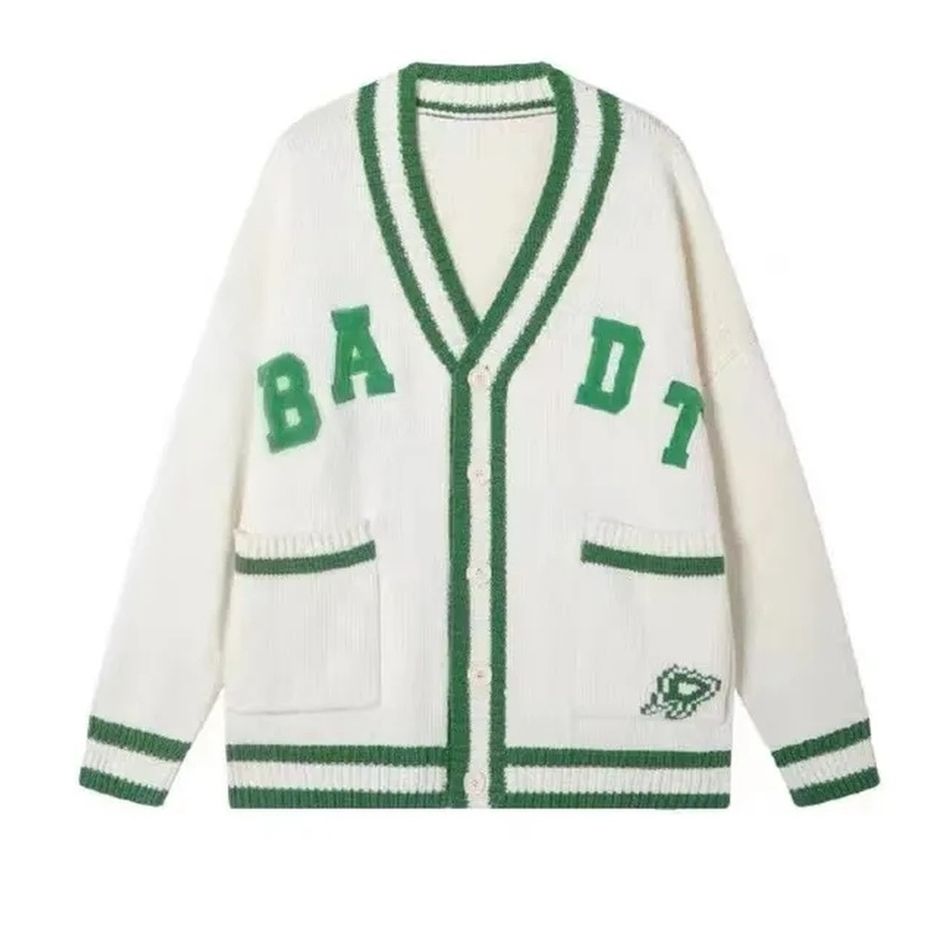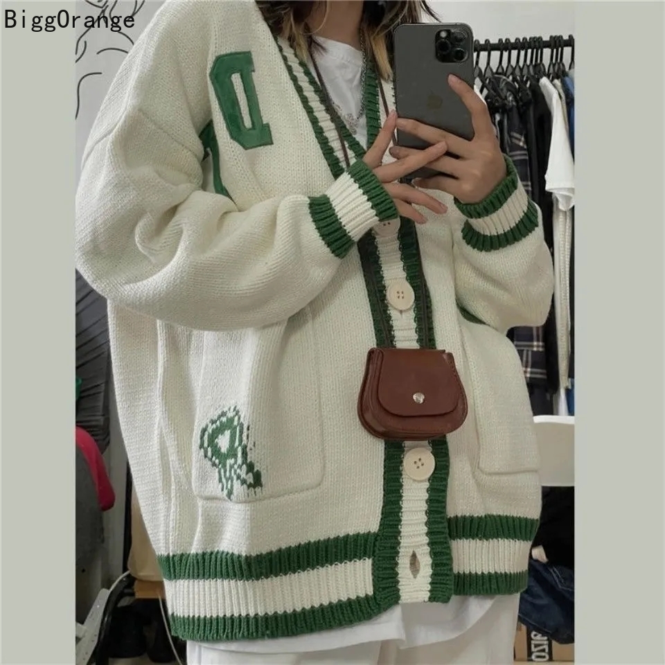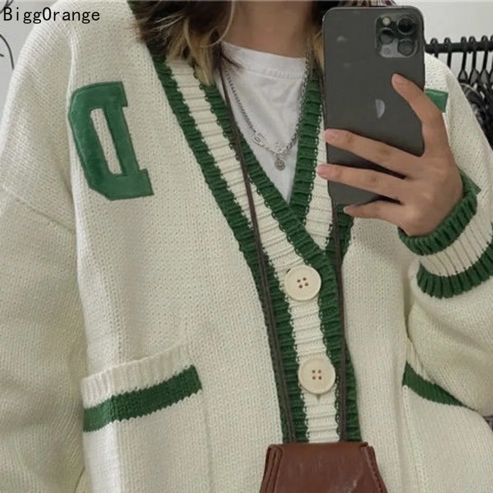 Vintage letter embroidery V-neck cardigan sweater women autumn and winter college style loose all-match knitted cardigan sweater