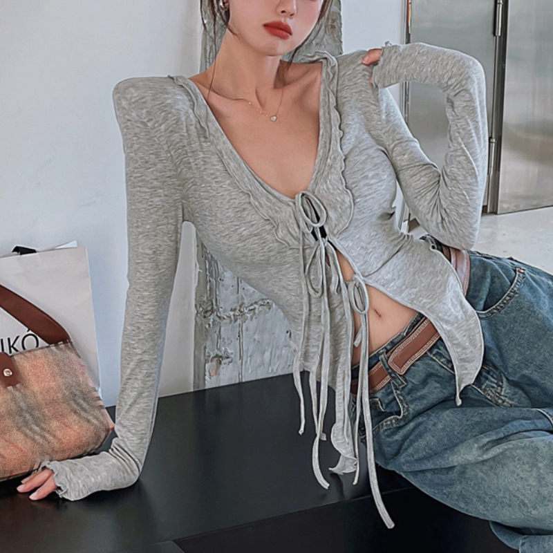 V-neck Sexy Hollow Lace-up Solid Color Long-sleeved T-shirt Women Summer Irregular Ruffled Casual Crop Tops