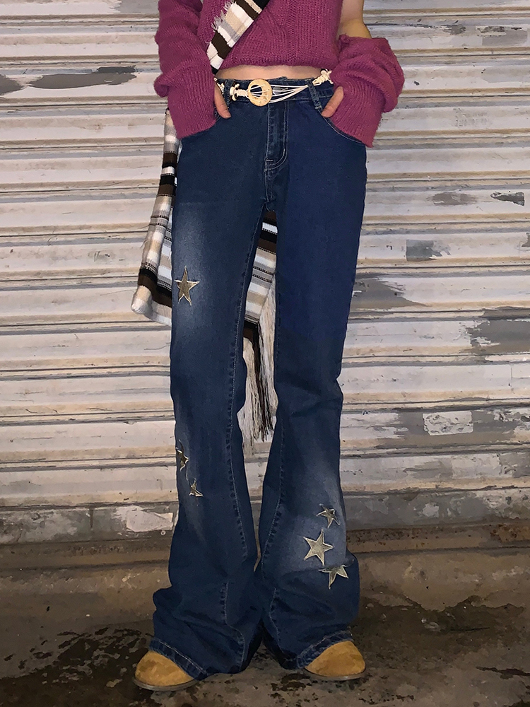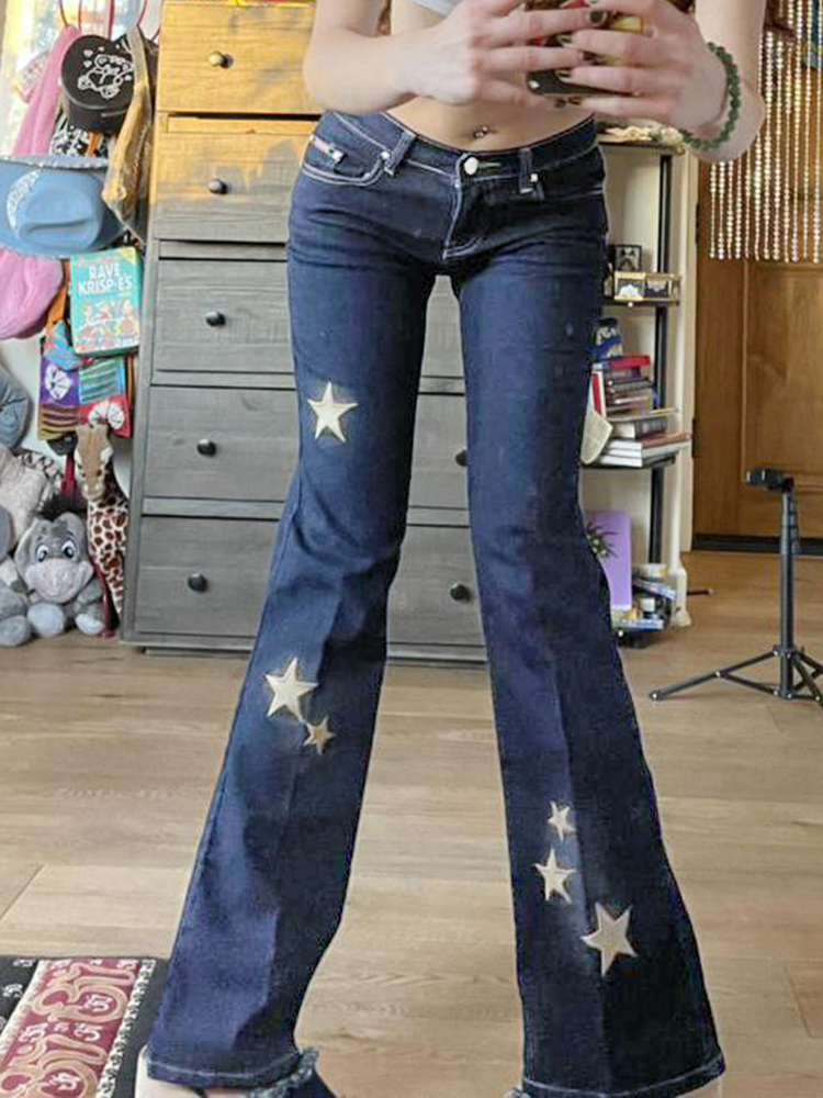 Waatfaak Star Printed Streetwear Y2K Jeans Vintage Low Waist Pockets Blue Denim Skinny Flare Jeans Women Low Rise Grunge Retro